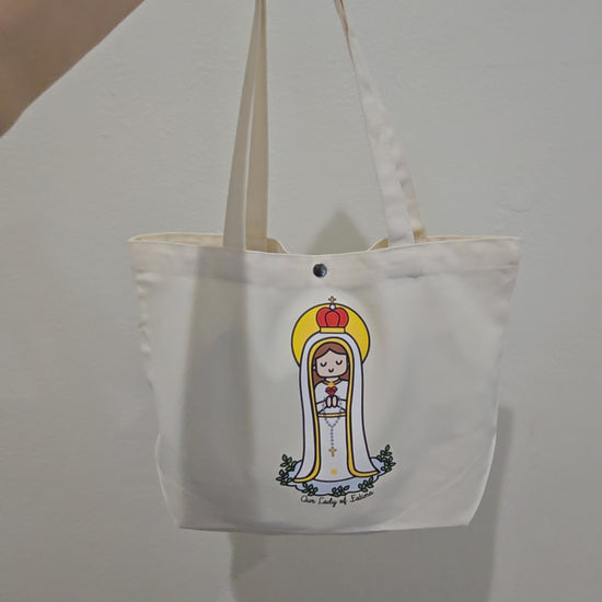Durable canvas tote (15" x 11" x 3.5") featuring Our Lady of Fatima, inspired by our 6-year-old artist. With 9" handles and a magnetic closure, it’s the perfect Catholic gift for daily use.