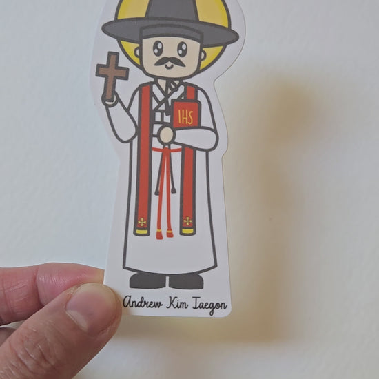 Brighten your day with our unique St. Andrew Kim Taegon 3.75" vinyl sticker, featuring an absolutely adorable design inspired by the pure imagination of a 6-year-old! This isn't just any sticker; it's a vibrant, joyful tribute to Saint Andrew Kim Taegon, the first native Korean Catholic priest and martyr, seen through the innocent and cheerful eyes of a child.